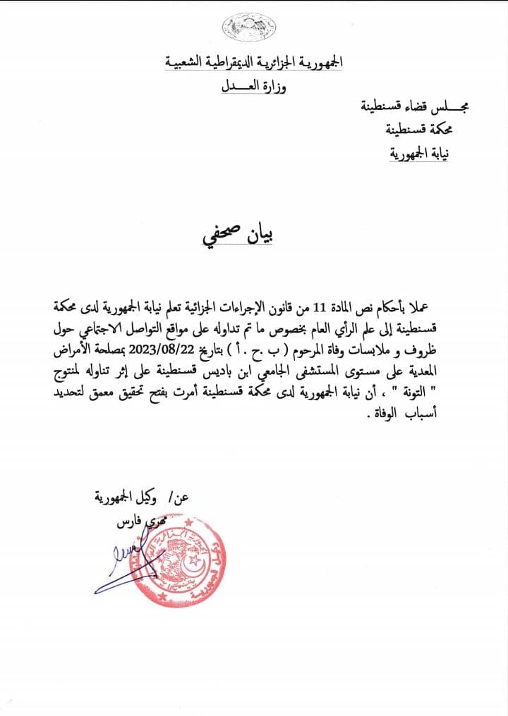 وأضاف البيان، أن نيابة الجمهورية لدى محكمة قسنطينة أمرت بفتح تحقيق معمق لتحديد أسباب الوفاة.