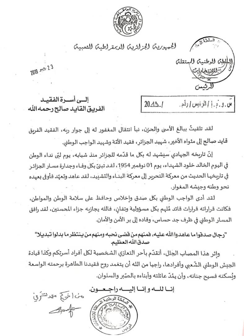 بعث رئيس السلطة المستقلة للإنتخابات محمد شرفي برسالة تعزية لعائلة الفقيد الفريق أحمد ڨايد صالح الذي وافته المنية اليوم عن عمر 79 سنة.