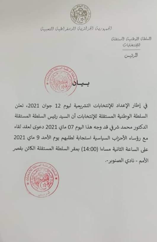 وبهذا فقد وجه محمد شرفي رئيس السلطة الوطنية المستقلة للإنتخابات اليوم دعوة لعقد لقاء مع رؤساء الأحزاب إستجابة لطلبهم.