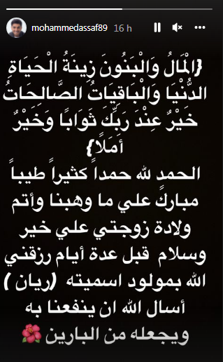 كما كتب عساف على ستوري حسابه بانستغرام: “المال والبنون زينة الحياة الدينا والباقيات الصالحات خير عند ربك ثوابا وخير أملا. الحمد لله حمداً كثيراً طيباً مباركً علي ما وهبنا وأتم ولادة زوجتي علي خير وسلام. قبل عدة أيام رزقني الله بمولود اسميته ريان. أسال الله ان ينفعنا به ويجعله من البارين”.