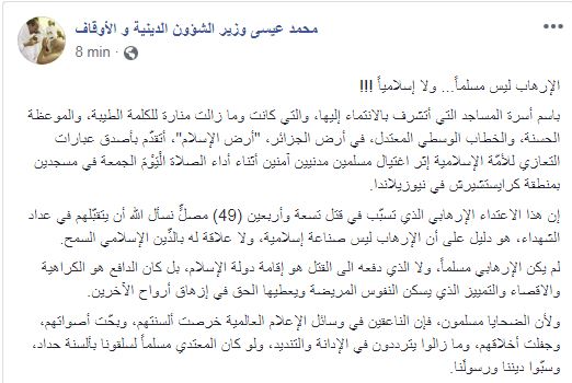 أستنكر وزير الشؤون الدينية والأوقاف محمد عيسى الاعتداء الإرهابي على مسجدين بمنطقة كرايستشيرش في نيوزيلندا.
