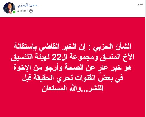 وكتب في منشور له على صفحته بفيسبوك، الإن الخبر القاضي بإستقالة الأخ المنسق ومجموعة الـ22 لهيئة التنسيق، معاذ بوشارب، هو خبر عارٍ عن الصحة.