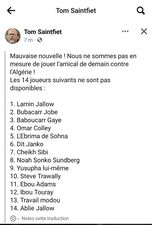 وأكّد مدرب غامبيا عدم جاهزية فريقه، حيث قال على صفحته الرسمية على “التويتر” “خبر غير مفرح، نحن لسنا جاهزين لمباراة الغد الودية امام الجزائر،  14 لاعبا غير جاهز للمباراة”.