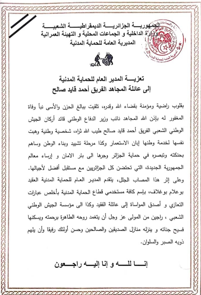 قدم المدير العام للحماية المدنية، بوعلام بوغلاف، تعازيه الخالصة، لعائلة الفقيد الفريق احمد قايد صالح.