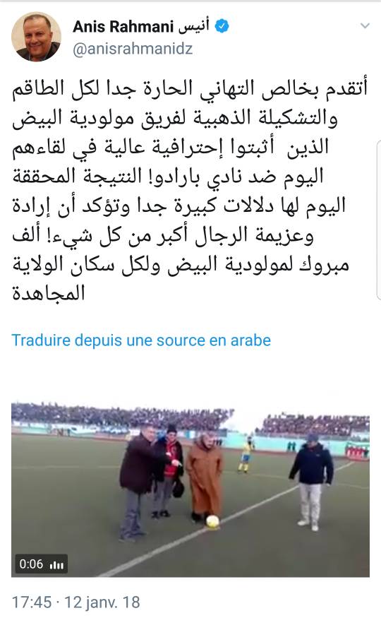 ونشر عبر صفحته الرسمية  بتويتر تغريدة جاء فيها:”أتقدم بخالص التهاني الحارة جدا لكل الطاقم والتشكيلة الذهبية لفريق مولودية البيض الذين أثبتوا إحترافية عالية في لقائهم ضد نادي بارادو”.