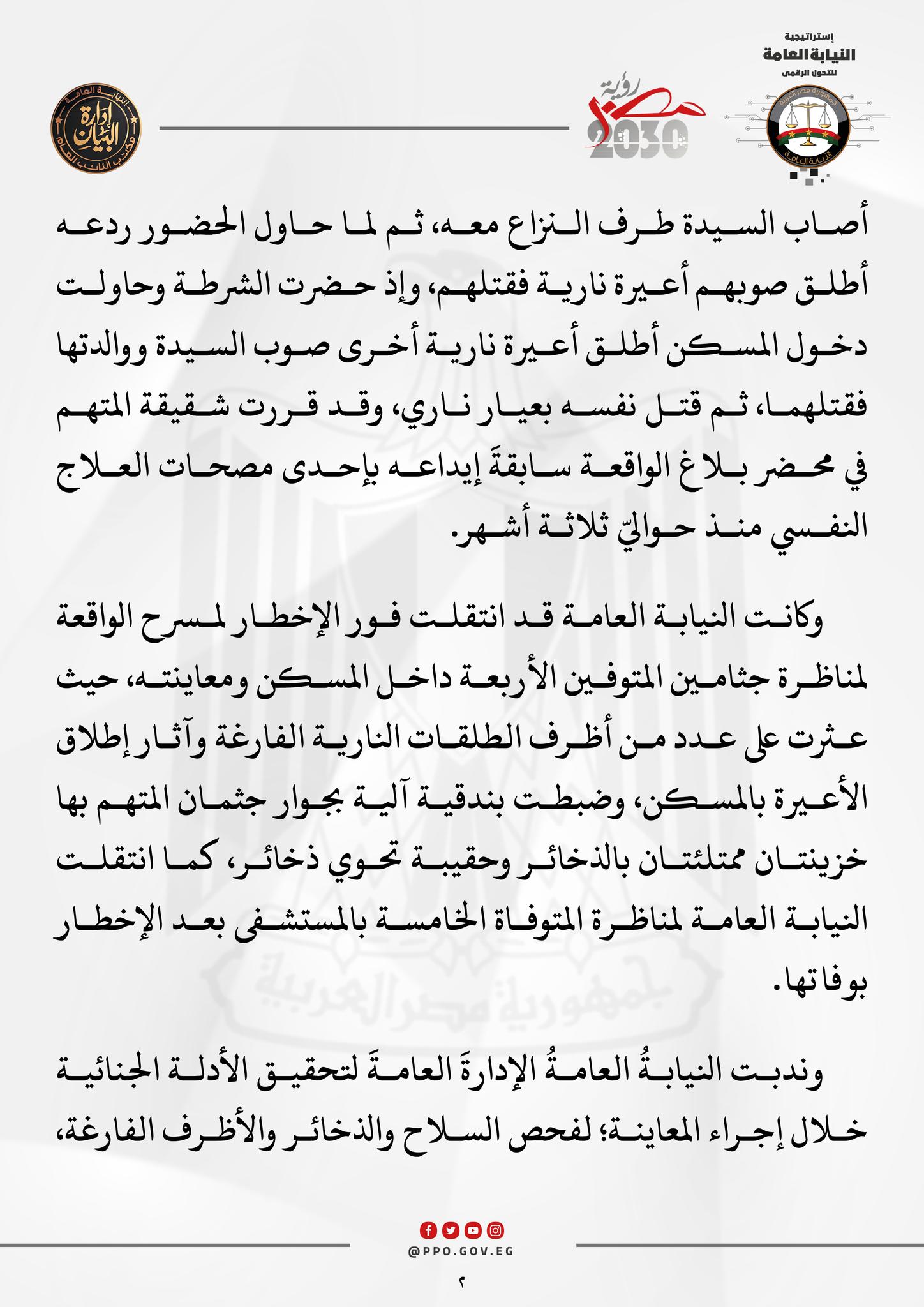 ولم يكشف البيان عن شخصية الضحايا الآخرين بخلاف الزوج وزوجته وأمها. فيما قالت صحف مصرية إن الضحيتين الأخرتين هما شقيقة القاتل وزوجها.