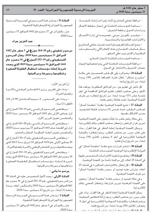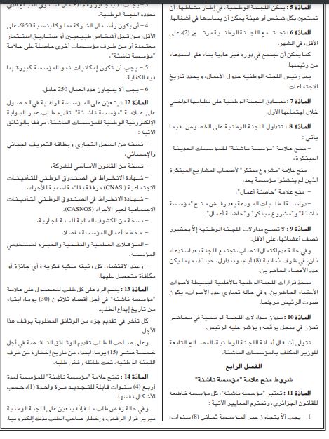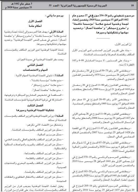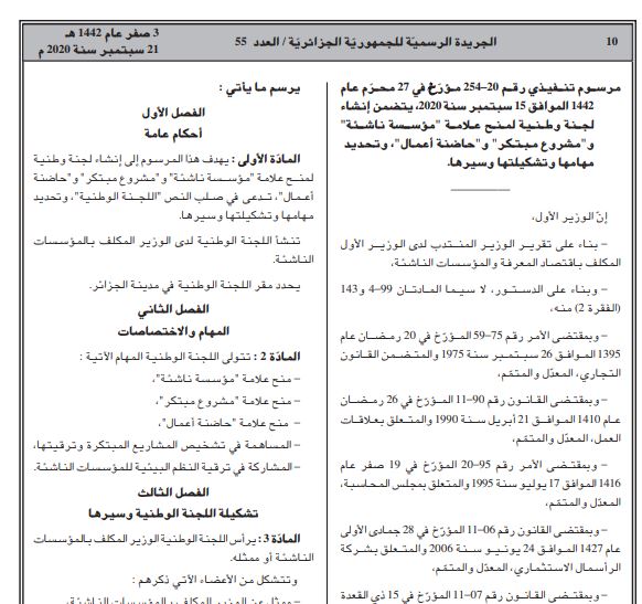تضمن العدد الأخير من الجريدة الرسمية صدور مرسوم رئاسي يتضمن إنشاء لجنة وطنية لمنح علامة ”مؤس سة ناشئة“ و“مشروع مبتكر“ و“حاضنة أعـمال“.