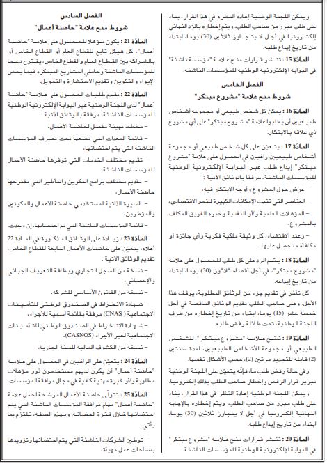 يهدف هذا المرسوم إلى إنشاء لجنة وطنية لمنح علامة ”مؤس سة ناشئة“ و“مشروع مــبــتــكـر“ و“حـاضنـة أعـمـال“.
