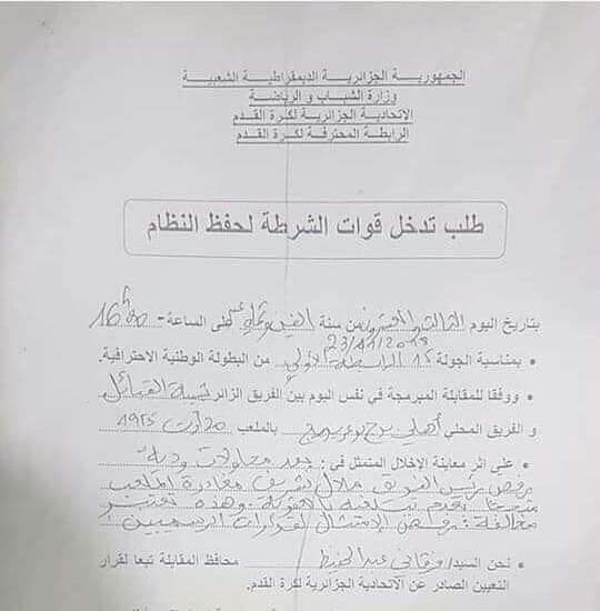 هذا كما توضح أيضا الوثيقة أدناه أن محافظ اللقاء إستنجد  برجال الشرطة لإخراج رئيس شبيبة القبائل من الملعب.