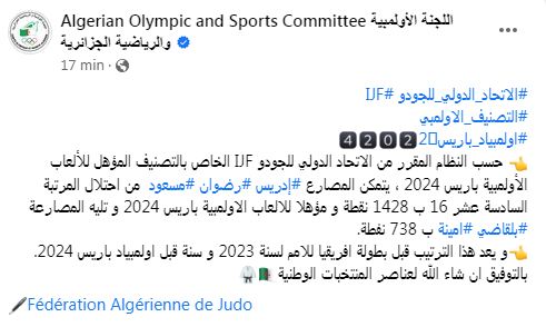 وأشارت اللجنة في منشور عبر حسابها على “فيسبوك” اليوم الاثنين، إلى أنه وحسب: “النظام المقرر من الاتحاد الدولي للجودو، الخاص بالتصنيف المؤهل للألعاب الأولمبية باريس 2024، يتمكن المصارع إدريس رضوان مسعود من احتلال المرتبة الـ 16 بـ 1428 نقطة ومؤهلا لألعاب باريس”.