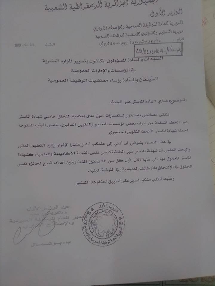 وأرسل الوظيف العمومي تعليمة إلى المسؤولون المكلفون بتسيير الموارد البشرية في المؤسسات والإدارات العمومية، رؤساء مفتشيات الوظيفة العمومية