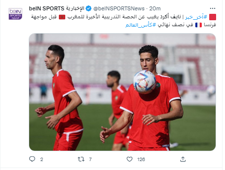 كشف موقع “بيان سبورتس” الإخبارية أن نجم منتخب المغرب نايف أكرد غاب عن الحصة الاستعدادية الأخيرة قبل مواجهة فرنسا.