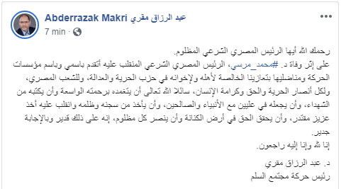 “على إثر وفاة د. محمد مرسي، الرئيس المصري الشرعي المنقلب عليه أتقدم باسمي وباسم مؤسسات الحركة ومناضليها بتعازينا