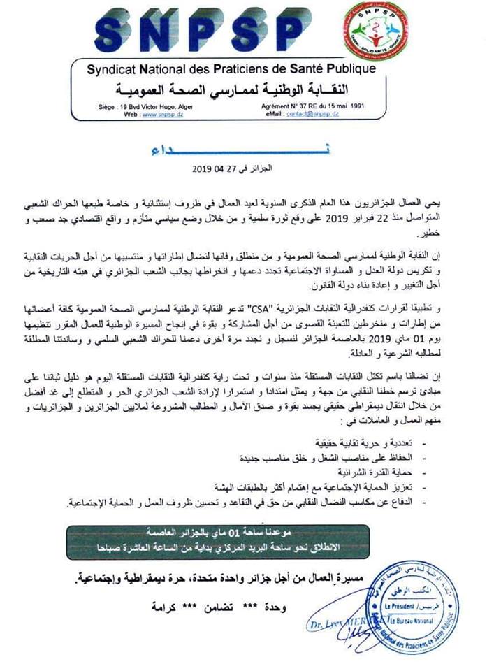 أعلنت نقابة ممارسي الصحة العمومية، مشاركتها في المسيرة الوطنية للعمال، المقررة يوم 1 ماي بالعاصمة، التي دعت اليها كنفدرالية النقابات الجزائرية، دعما للحراك الشعبي.