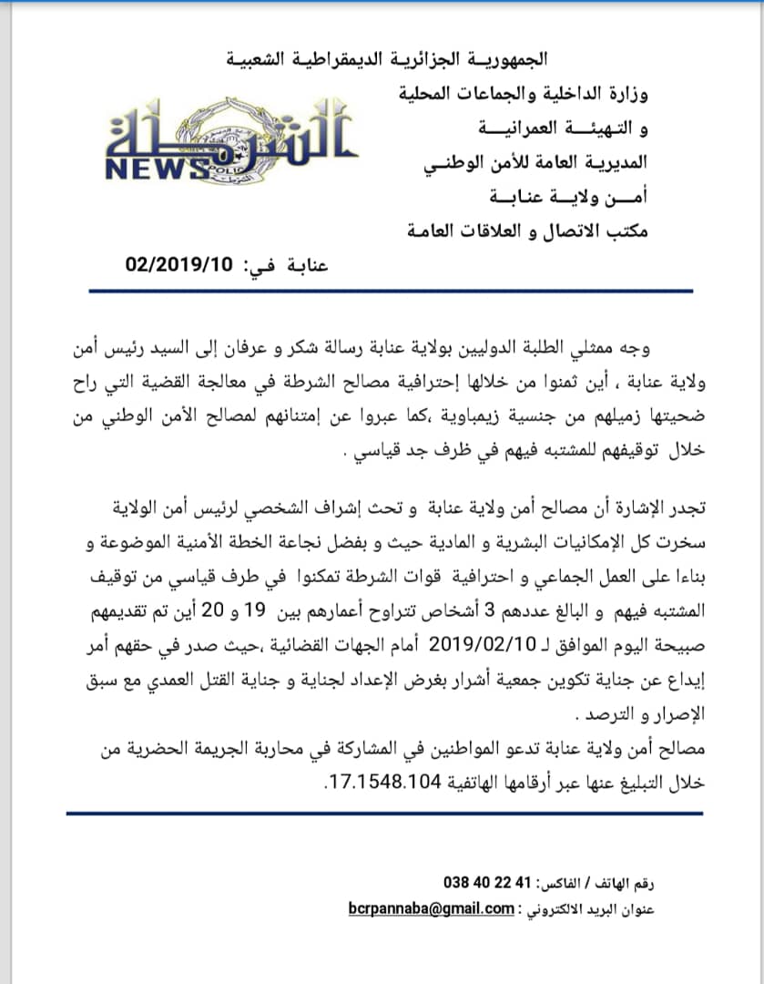 أشاد ممثلو الطلبة الدوليين بولاية عنابة، بإحترافية مصالح الشرطة بالولاية في الطريقة التي عالجت بها قضية مقتل الطالب الزيمبابوي.
