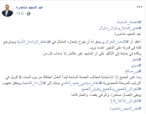 وقال مناصرة في منشور له على الفايس بوك ،:” إنّ الجزائريين في حاجة إلى التأكيد على أن المشهد غير مكتمل إلا بذهاب باقي النظام”.
