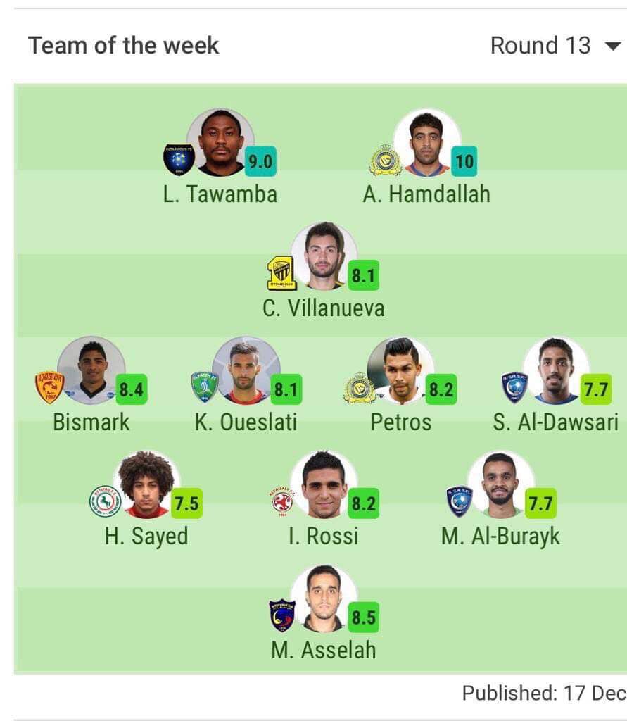 وفي سياق آخر تم إختيار عسلة ضمن التوليفة المثالية للجولة 13 من الدوري السعودي، بعد حصوله على تنقيط 8.5 على 10.