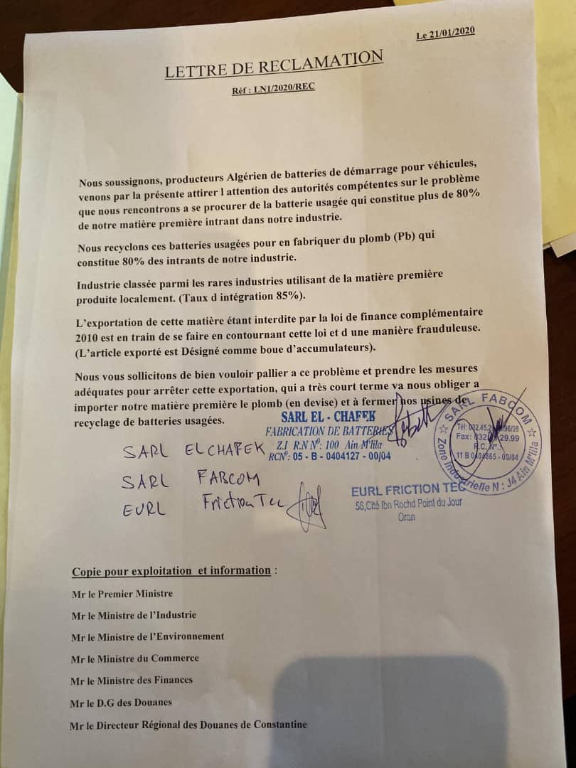 ودعى المنتجون في المراسلة الحكومة بفتح تحقيق لإيقاف عمليات التصدير غير قانونية، لما يعتبر مادة أولية بالنسبة لهم و المتمثل اساسا في الرصاص plomb الموجود في البطاريات المستعملة.