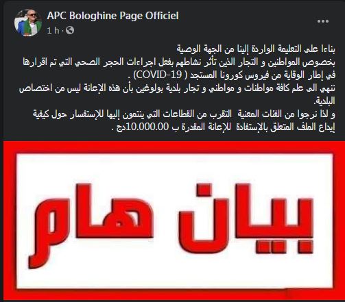 وجاء في بيان مصالح البلدية على صفحتها الرسمية بفيسبوك “بناءا على التعليمة الواردة إلينا من الجهة الوصية، بخصوص المواطنين والتجار الذين تأثر نشاطهم بفعل اجراءات الحجر الصحي التي تم اقرارها في إطار الوقاية من فيروس كورونا المستجد، ننهي الى علم كافة مواطنات ومواطني وتجار بلدية بولوغين بأن هذه الإعانة ليس من اختصاص البلدية”.