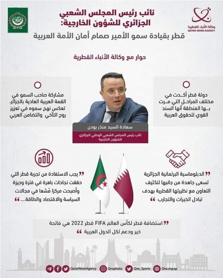 أكد نائب رئيس المجلس الشعبي الوطني منذر بودن، أن مشاركة أمير دولة قطر في القمة العربية تعكس نهج سموه في تعزيز روح التآخي والتضامن العربي.