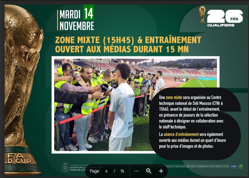 وأشارت الاتحادية إلى أن لاعبي الخضر، سيجرون اليوم الثلاثاء. منطقة مختلطة بداية من الساعة 15:45، قبل انطلاق الحصة التدريبية الثانية للمنتخب بسيدي موسى.
