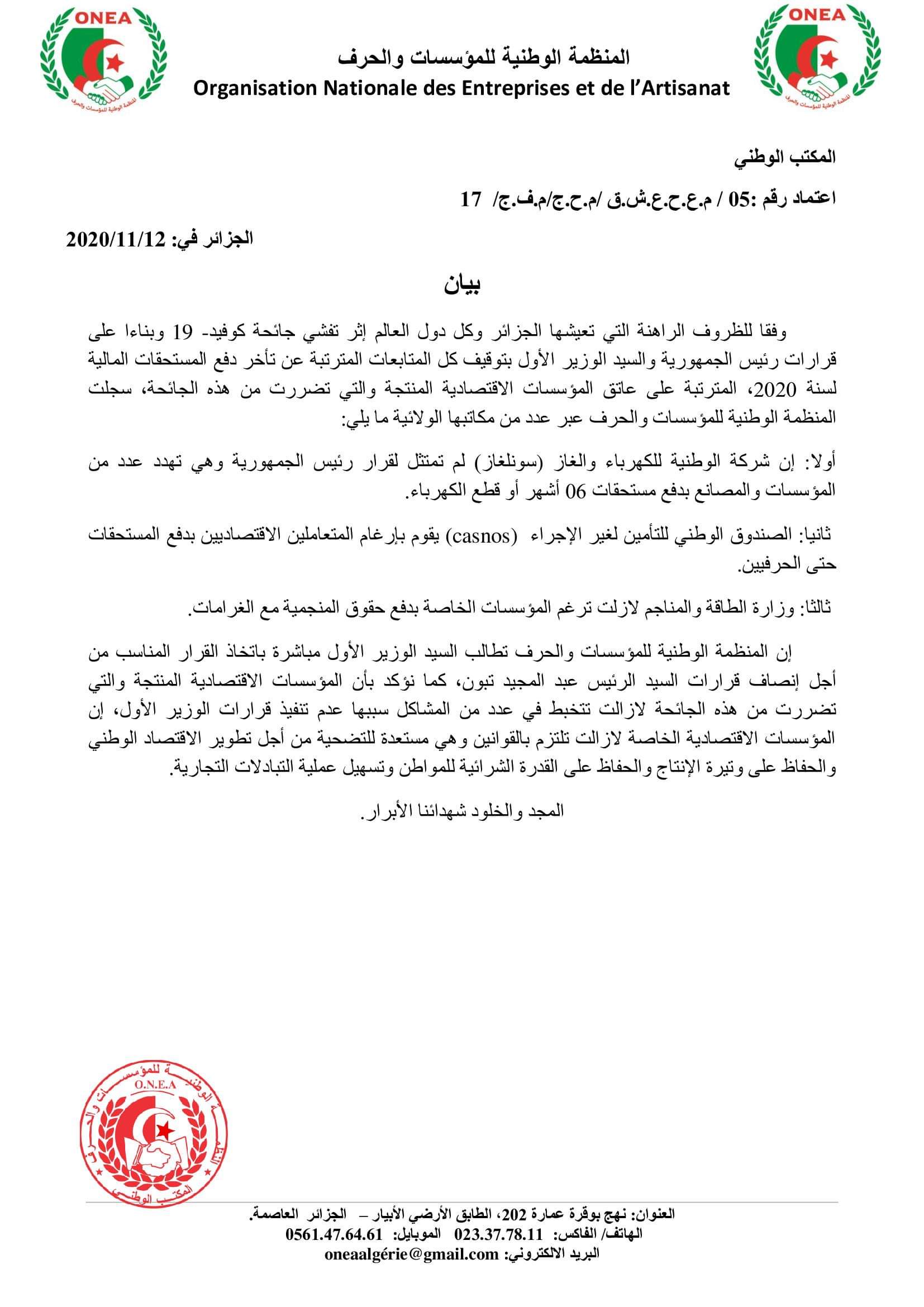 وحسب بيان للمنظمة فإن وقف الاجراءات المتخذة ضد المتعاملين الاقتصاديين يجب أن يكون امتثالا لقرارات رئيس الجمهورية والوزير الاول عبد العزيز جراد.