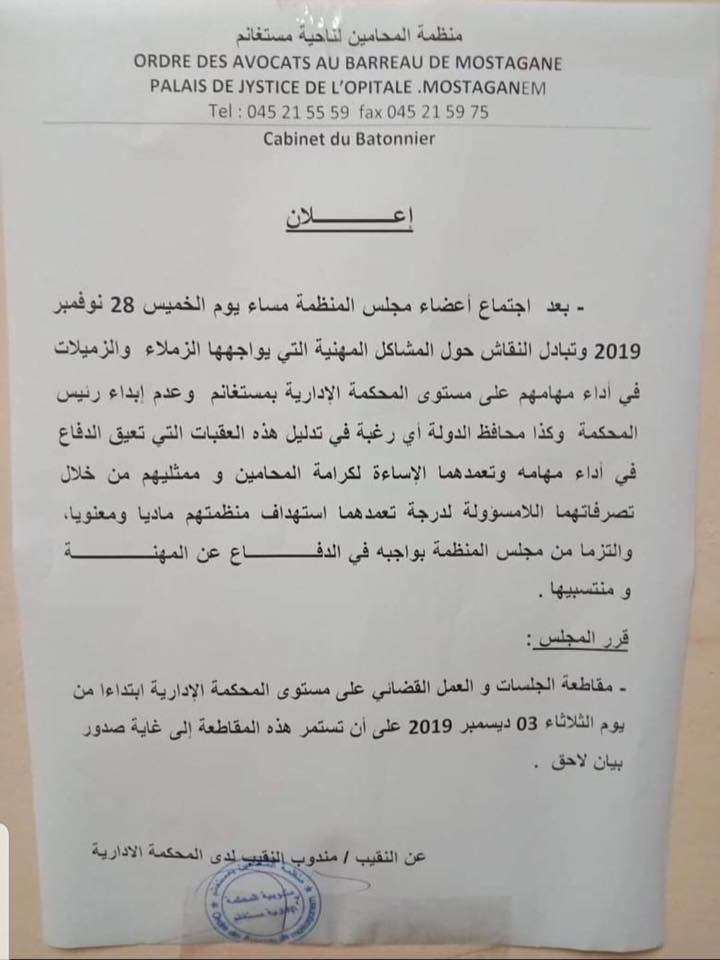 أعلنت منظمة المحامين لناحية مستغانم عن  مقاطعة العمل القضائي بالمحكمة الإدارية بداية من تاريخ اليوم إلى أجل غير مسمى.