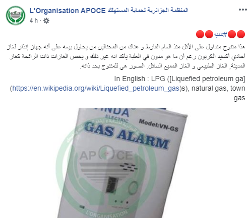 نبّهت منظمة حماية المستهلك، من منتوج يتم تداوله منذ العام الفارط، خاص بالإنذار عن غاز أحادي أكسيد الكربون.