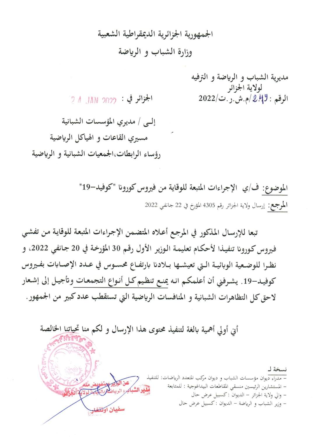 وقررت مُديرية الشباب والرياضة والترفيه لولاية الجزائر منع تنظيم كل أنواع التجمعات وتأجيل إلى إشعار لاحق كل التظاهرات الشبانية والمنافسات الرياضية التي تستقطب عدد كبير من الجمهور.