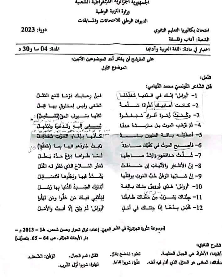 وتمثل الموضوع الأول، بالنسبة لشعبة آداب وفلسفة، في شعر حول الثورة الجزائرية “مقاومة الأوراس”. فيما تناول الموضوع الثاني نصا يتحدث حول السعادة والتضحية.