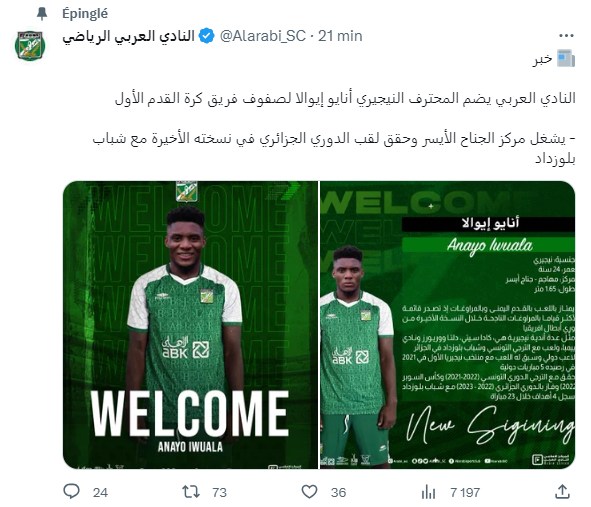 كما ذكّر نادي العربي الكويتي الجميع بفوز اللاعب النيجيري بالبطولة الوطنية رفقة فريق شباب بلوزداد الموسم الماضي.