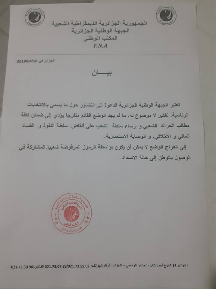 “ما لم يجد الوضع القائم متفرجا يؤدي إلى ضمان كافة مطالب الحراك الشعبي وإرساء سلطة الشعب على أنقاض سلطة النفوذ والفساد المالي والأخلاقي والوصاية الإستعمارية”.