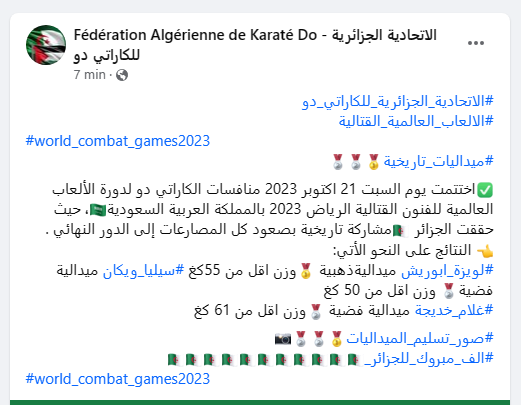 كشفت الاتحادية الجزائرية لـ “الكاراتي دو”، اليوم السبت، عن إختتام المنافسات لدورة الألعاب العالمية للفنون القتالية 2023.