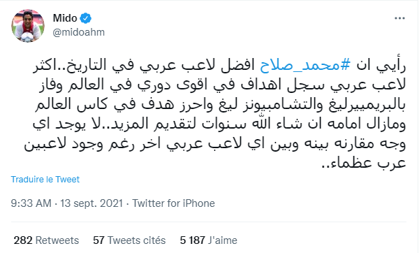 ونشر ميدو، تغريدة عبر حسابه الرسمي على “تويتر” قال فيها: “رأيي أن محمد صلاح، أفضل لاعب عربي في التاريخ”.
