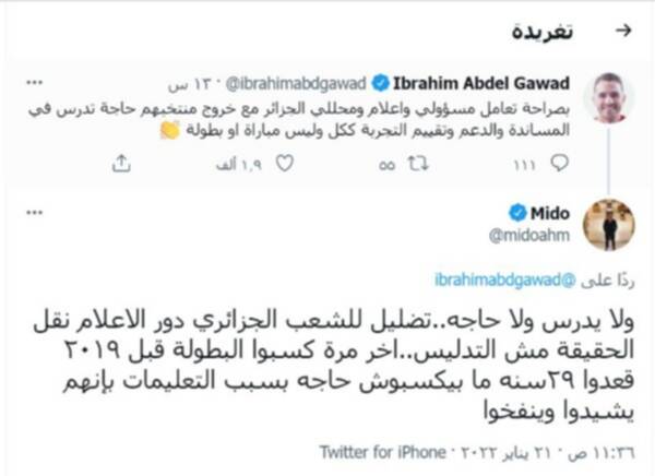 ونشر الإعلامي إبراهيم عبد الجواد، تغريدة أشاد خلالها بتعامل الإعلام الجزائري حيث قال:”بصراحة تعامل مسئولي وإعلام ومحللي الجزائر مع خروج منتخبهم، حاجة تدرس في المساندة والدعم وتقييم التجربة ككل وليس مباراة أو بطولة”.
