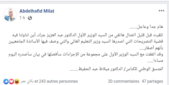 وأكد ميلاط في منشور له على صفحته الرسمية على موقع التواصل الإجتماعي فايسبوك، أنه تناول خلال حديثه مع الوزير الأول  التصريحات التي أصدرها وزير التعليم العالي والتي وصف فيها الأساتذة الجامعيين أنهم أصفار.
