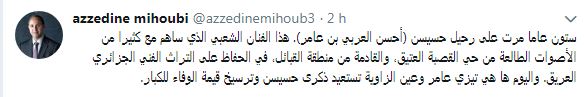 وقال ميهوبي: “هذا الفنان الشعبي الذي ساهم مع كثيرا من الأصوات الطالعة من حي القصبة العتيق، والقادمة من منطقة القبائل في الحفاظ على التراث الفني الجزائري العريق”.
