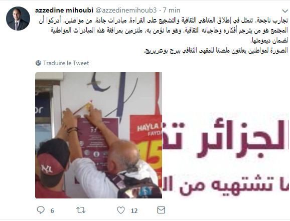 هذا وأرفق ميهوبي تغريدته بصورة لمواطنين يعلقون ملصقا للمقهى الثقافي ببرج بوعريريج.