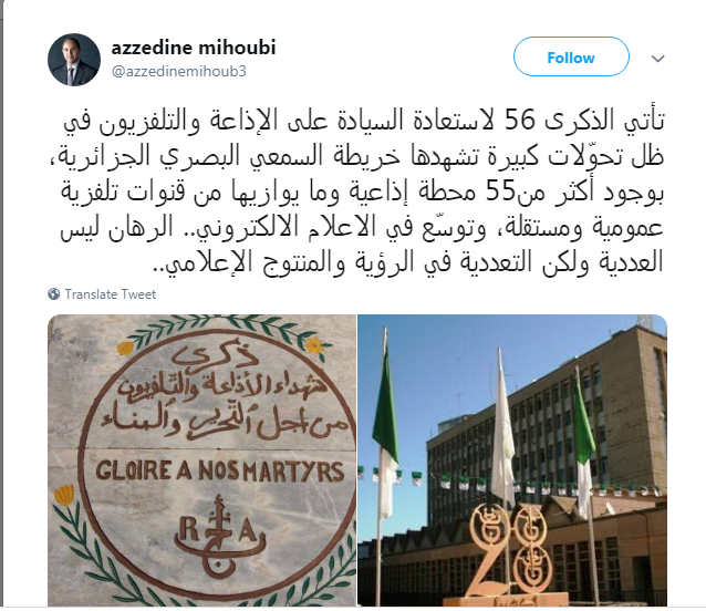 وأضاف ميهوبي في تغريدة له على صفحته بـ”التويتر”،اليوم الأحد،”أنّنا نحي الذكرى بوجود أكثر من 55 محطة إذاعية ومايوازيها من قنوات تلفزية عمومية ومستقلة وتوسّع إعلامي”.