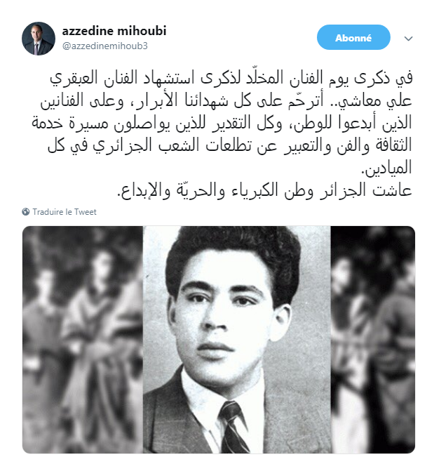 ترحّم وزير الثقافة السابق عز الدين ميهوبي على روح علي معاشي، وذلك في ذكرى يوم الفنان، المصادف لاستشهاد الفنان معاشي.
