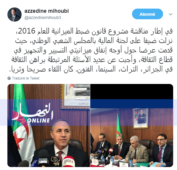 عرض وزير الثقافة عز الدين ميهوبي ميزانيتي التسيير والتجهيز لسنة 2016 المخصصة لوزارته على لجنة المالية بمجلس الأمة.