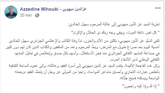 ونشر ميهوبي على صفحته الرسمية في فايسبوك تعزية إلى عائلة المرحوم سهيل الخالدي: تلقى عز الدّين ميهوبي، بكثير من الألم والحزن، نبأ وفاة الكاتب والإعلامي الجزاىري سهيل الخالدي أمسية اليوم بعد صراع طويل مع المرض، ويعدّ المرحوم واحد من المثقفين والكتاب الذين كان لهم دور كبير في صناعة المشهد الثقافي الجزائري منذ فجر الاستقلال، وأسهم بكل صدق وإخلاص في تمثيل المشهد الثقافي الوطني لدى الأشقاء العرب.