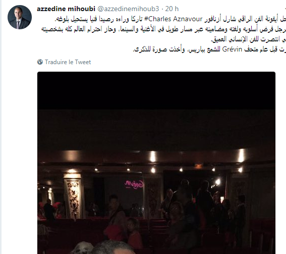هذا ونشر ميهوبي تغريدة له على “تويتر” كتب فيها “رحل أيقونة الفن الراقي شارل أزنافور تاركا وراءه رصيدا فنيا يستحيل بلوغه”.