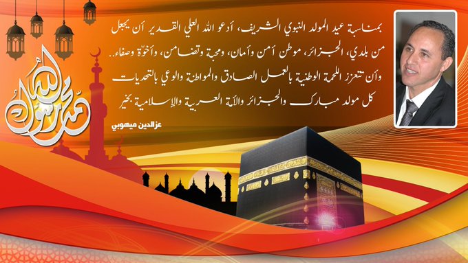 هنئ المترشح للرئاسيات عن “الارندي” عز الدين ميهوبي الجزائريين والجزائريات بمناسبة المولد النبوي الشريف.