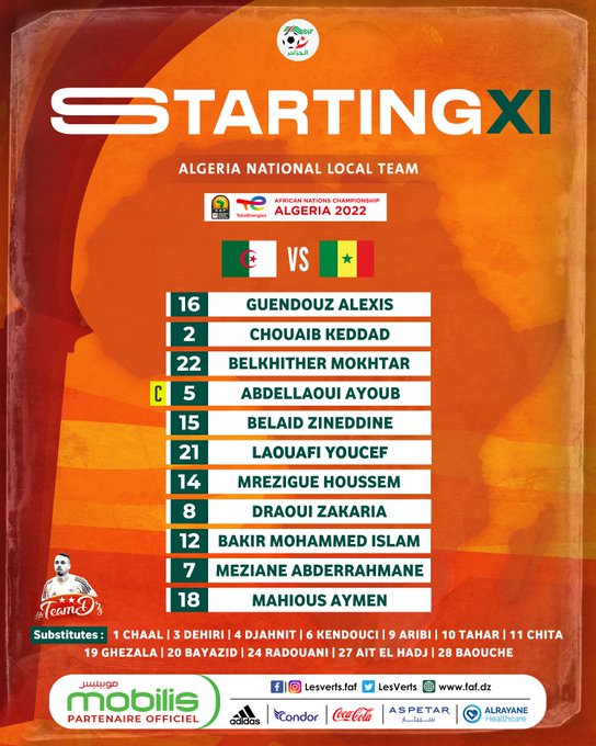وعرفت التشكيلة الأساسية التي ستخوض نهائي مُنافسة كأس أمم إفريقيا للاعبين المحليين 2022 تغييران مُقارنة بمواجهة المربع الذهبي أمام النيجر.