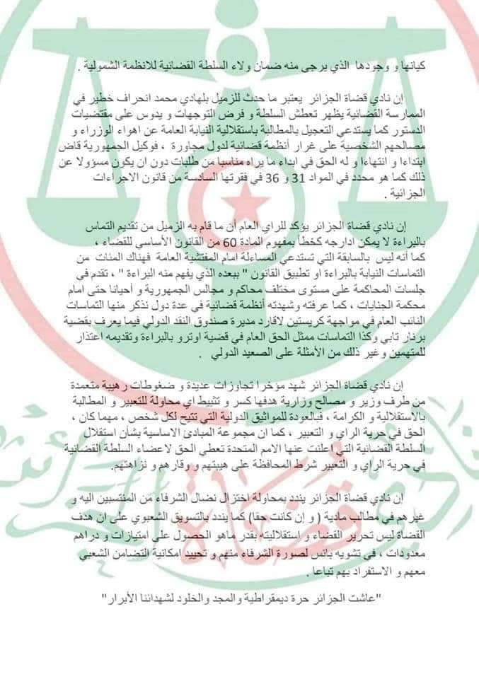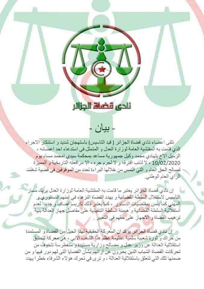 وعبر النادي، في بيان له، عن إستنكاره الشديد بإستدعاء المفتشية العامة لوزارة العدل، لوكيل جمهورية مساعد بمحكمة سيدي أمحمد، بلهادي محمد، مساء يوم أمس الإثنين.