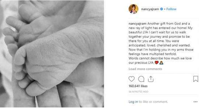وقد علقت نانسي على الصورة قائلةً: “هبة أخرى من الله وشعاع جديد من الضوء قد دخلت منزلنا يا ليا الجميلة”.