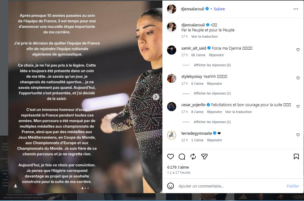 وواصلت صاحبة الـ 21 ربيعا: “لقد قررت مغادرة منتخب فرنسا للانضمام إلى المنتخب الوطني الجزائري للجمباز.”