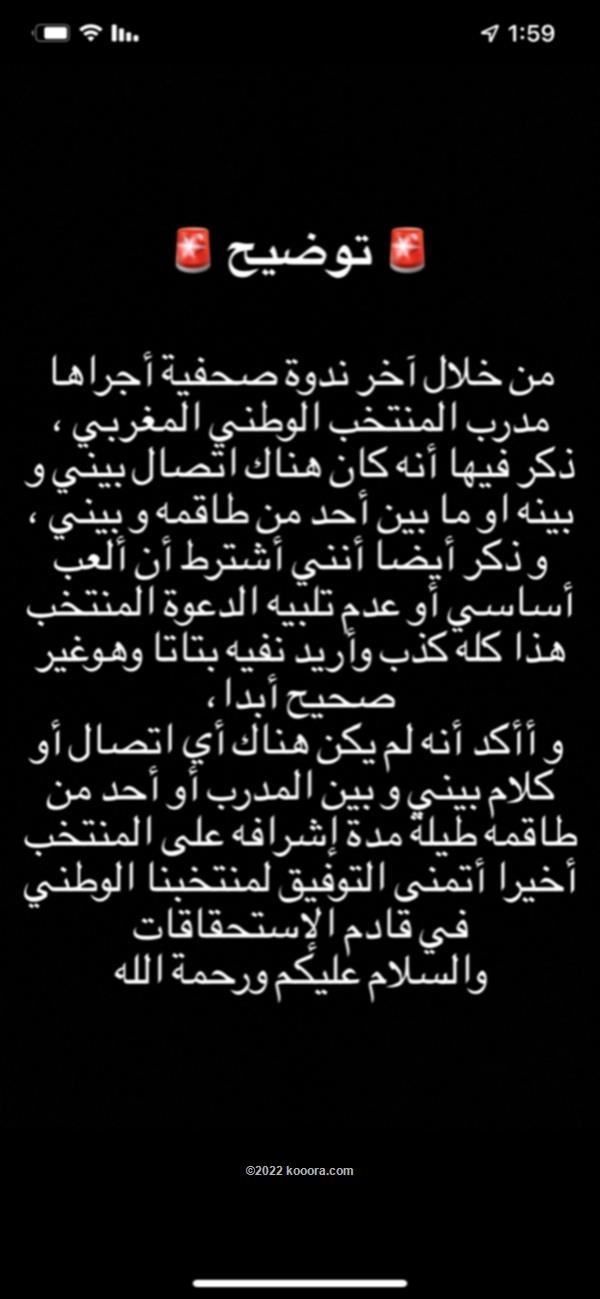 كما قال:”توضيح.. من خلال آخر ندوة صحفية أجراها مدرب المنتخب الوطني المغربي، ذكر فيها أنه كان هناك اتصال بيني وبينه، أو بين أحد من طاقمه وبيني”.