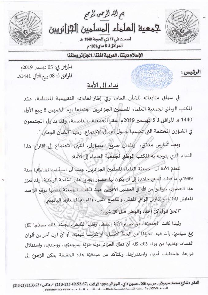 وتوج اجتماع المكتب الوطني للجمعية بنداء وجهته للأمة نشرته على صفحتها الرسمية في فايسبوك: في سياق متابعاته للشأن العام، وفي إطار لقاءاته التقييمية المنتظمة، عقد المكتب الوطني لجمعية العلماء المسلمين الجزائريين اجتماعا، وقد تداول المجتمعون في الشؤون المختلفة التي تضمنها جدول أعمال الاجتماع، ومنها “الشأن الوطني” .